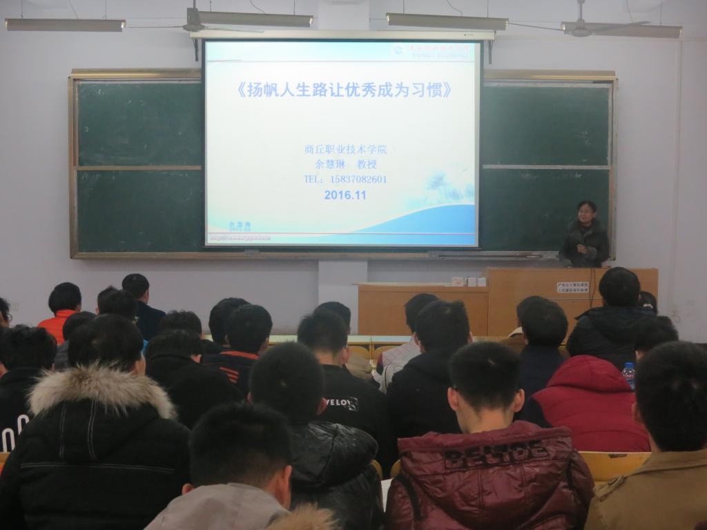 2016年12月26日 ,余慧琳教授在明德楼南五合堂讲解了《杨帆人生路让优秀成为习惯》讲座。余慧琳教授告诉我们要勤奋 努力 好学 会学;要学最好的别人,做最好的自己。要借人之智,完善自己。要注意自己的思想,他会变成自己的言语;要注意自己的言语,他会变成自己的行动;要注意自己的行动,他会变成自己的习惯;要注意自己的习惯,他会变成自己的性格;要注意自己的性格,他会变成自己的命运。
