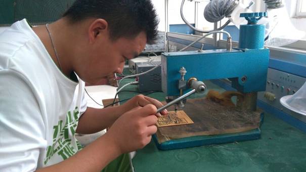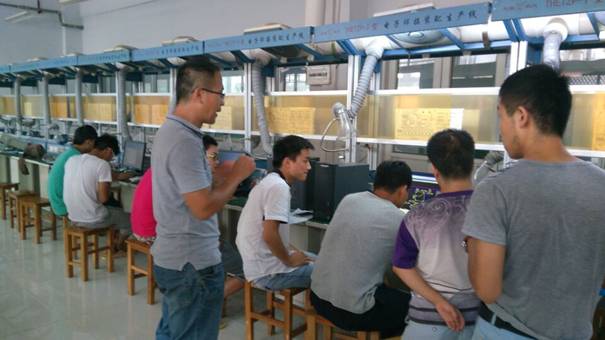 队员在认真的对电路板钻孔