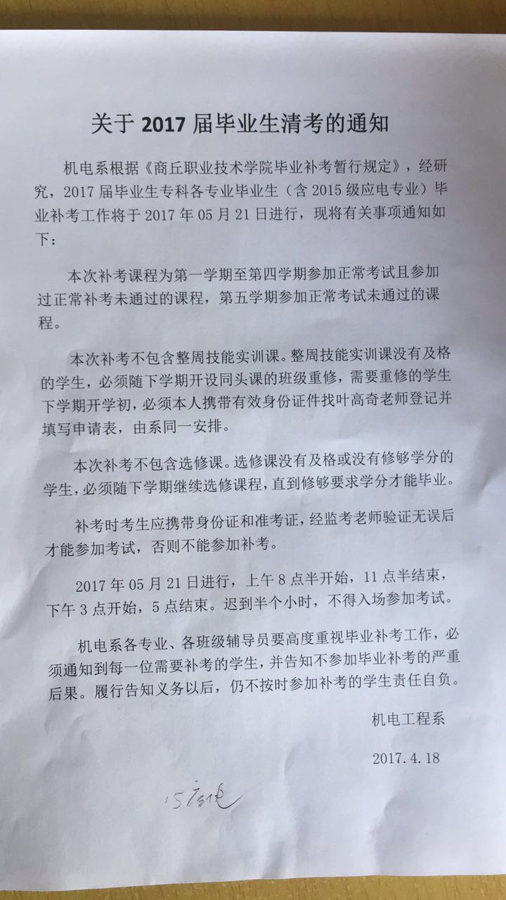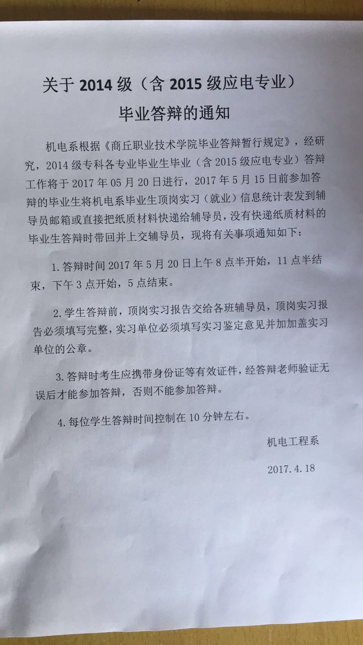 亚洲体育36517届毕业生清考与14级(含15级应电专业)毕业答辩通知